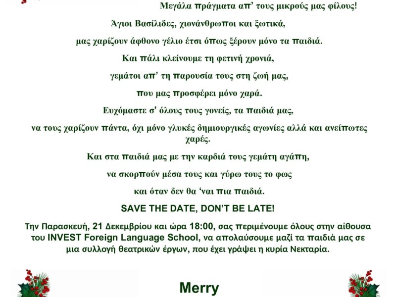 Η θεατρική σκηνή του INVEST φιλοξένησε φέτος τα Χριστούγεννα ένα κλασσικό αριστούργημα του Κ. Ντίκενς σε διασκευή και σκηνοθεσία Ν. Ρουσογιαννάκη